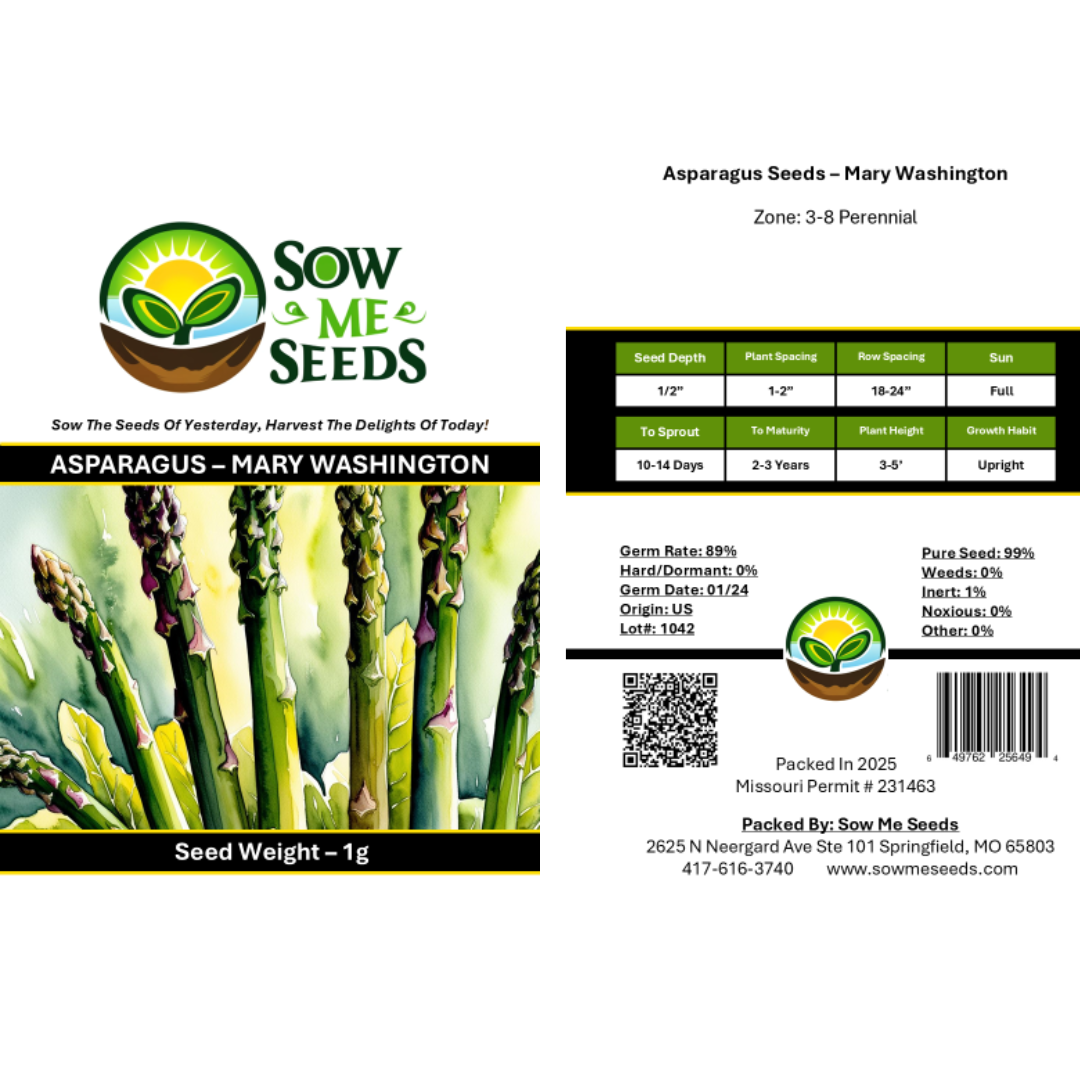 Mary Washington is a time-honored heirloom asparagus variety grown for its tender, flavorful spears and reliable long-term production. This perennial favorite is easy to establish from seed and returns year after year with abundant early-spring harvests.