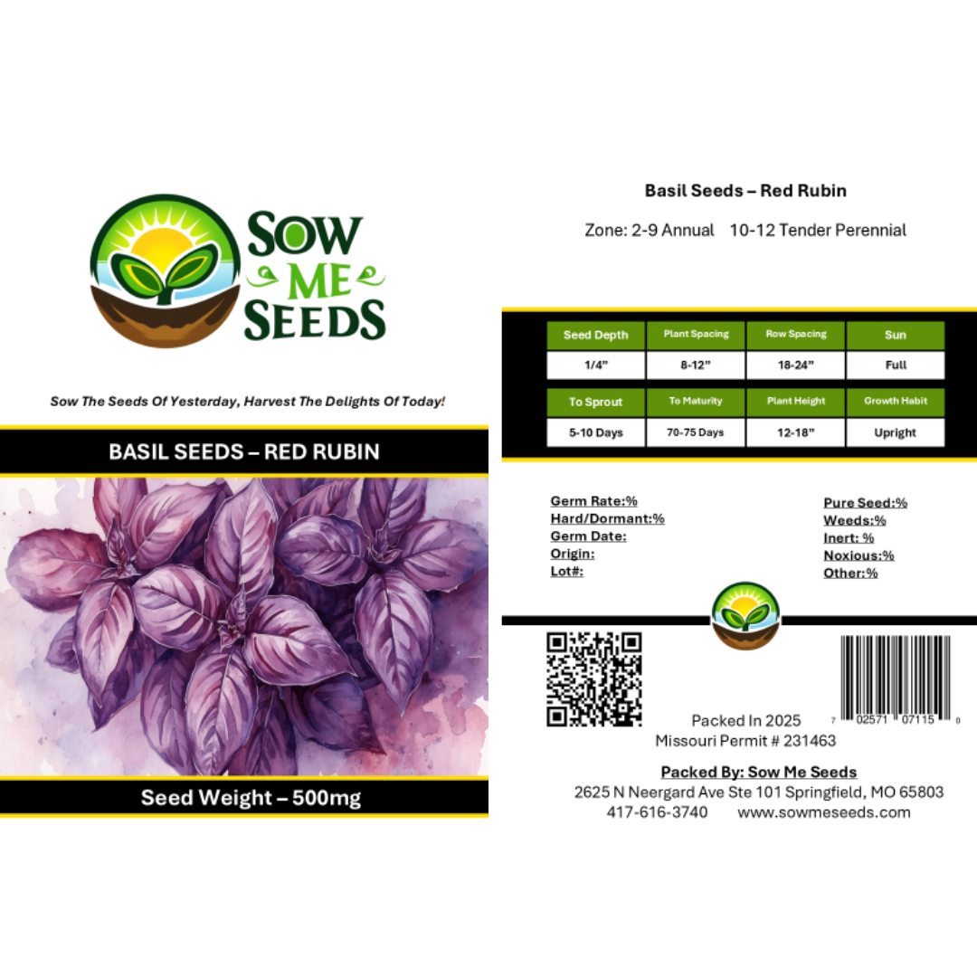 Red Rubin Basil is a striking heirloom variety that combines ornamental beauty with classic basil flavor. Its deep burgundy leaves stand out in the garden and add bold color and aroma to a wide range of dishes. Compact and easy to grow, itβs perfect for both containers and garden beds.