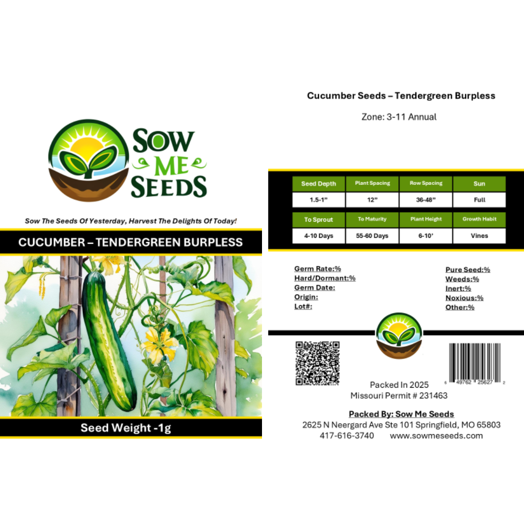 Tendergreen Burpless is a reliable heirloom cucumber known for its smooth skin, mild flavor, and low bitterness. These productive vines yield crisp, straight fruits perfect for slicing, snacking, or fresh salads — all without the usual burp!