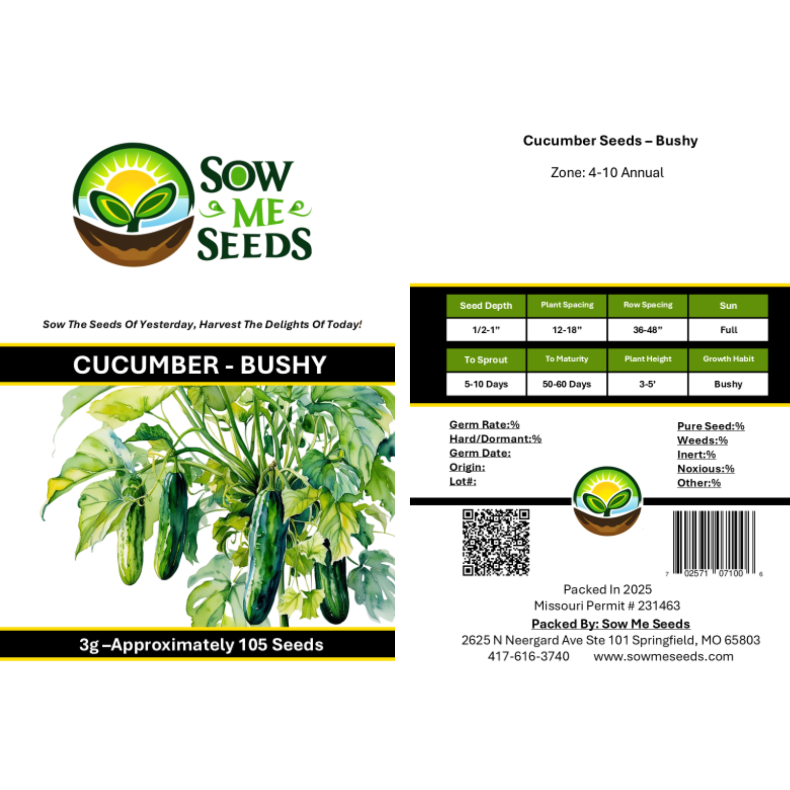 Bushy Cucumber is a compact heirloom variety perfect for small gardens and containers, producing crisp, flavorful cucumbers on short, tidy vines. Ideal for fresh eating and pickling, this early producer delivers impressive yields without needing much space.
