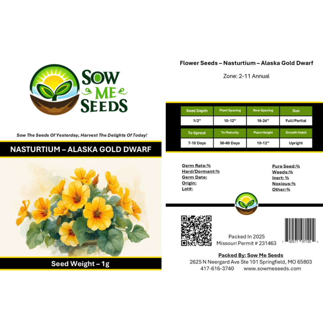 Alaska Gold Dwarf Nasturtiums are a striking heirloom variety featuring bright golden-yellow blooms and eye-catching marbled foliage. These compact plants grow easily in containers, beds, or along borders, offering vibrant color and edible flowers. They're also a natural pest deterrent, making them a smart, beautiful companion in the garden.
