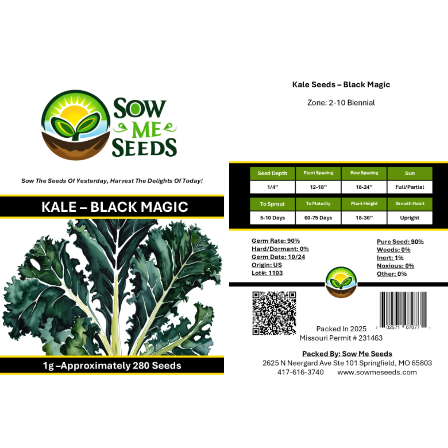 This dark-leaved heirloom kale is a heat-tolerant variety of Lacinato, offering rich flavor and stunning garden appeal. Black Magic Kale features long, deeply savoyed leaves that deepen in color as they mature β perfect for fresh salads, sautΓ©s, or crispy kale chips.