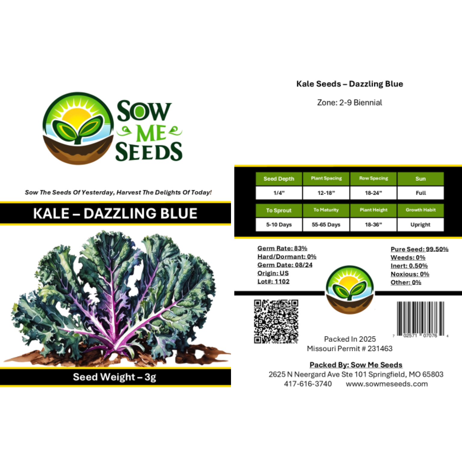 This vibrant Lacinato-style kale features striking blue-green leaves with bright pink-purple veins. Dazzling Blue is a standout in both flavor and appearance, offering sweet, tender greens that thrive in cool weather and hold up well after frost.