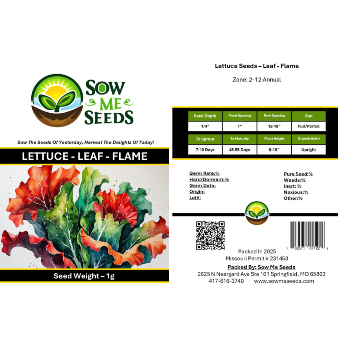 Flame Leaf Lettuce stands out with its vibrant burgundy tips and crisp, ruffled leaves. This beautiful loose-leaf variety is perfect for cool-season gardens, offering both ornamental charm and delicious, tender greens. A dependable heirloom favorite that thrives in spring and fall.