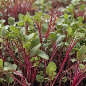 Culinary Uses: These microgreens are perfect for salads, wraps, and sandwiches, offering both a tender crunch and vibrant color. Their sweet, earthy taste complements grain bowls, stir-fries, and roasted vegetables, while their bold red stems add a striking visual element to soups and appetizers. These microgreens are also excellent for juicing or blending into smoothies for a nutrient-rich boost.