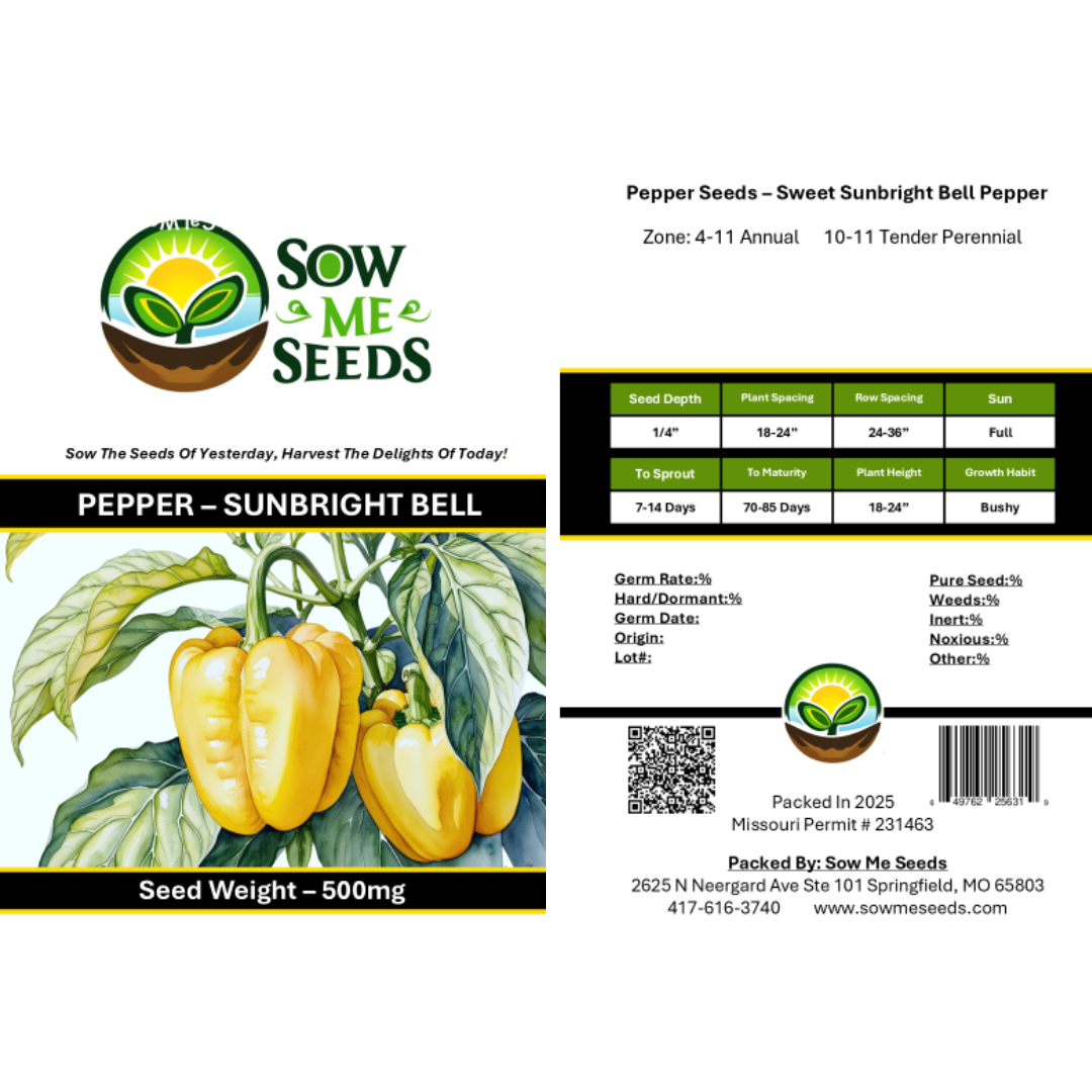 Sunbright Sweet Bell Pepper is a sunny yellow heirloom variety known for its blocky shape, crisp texture, and sweet, mild flavor. These vibrant peppers ripen from green to golden yellow and are perfect for stuffing, slicing, or enjoying fresh from the garden.