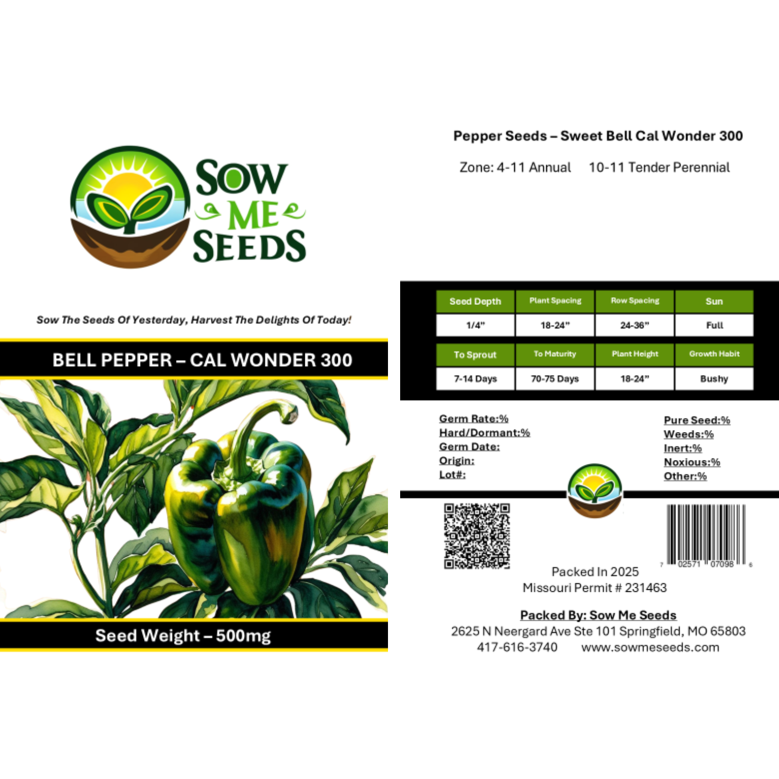 Cal Wonder 300 TMR is a classic sweet bell pepper variety prized for its thick walls, blocky shape, and crisp, juicy bite. This heirloom favorite grows beautifully in garden beds or containers, producing reliable yields of glossy green peppers that ripen to rich red.