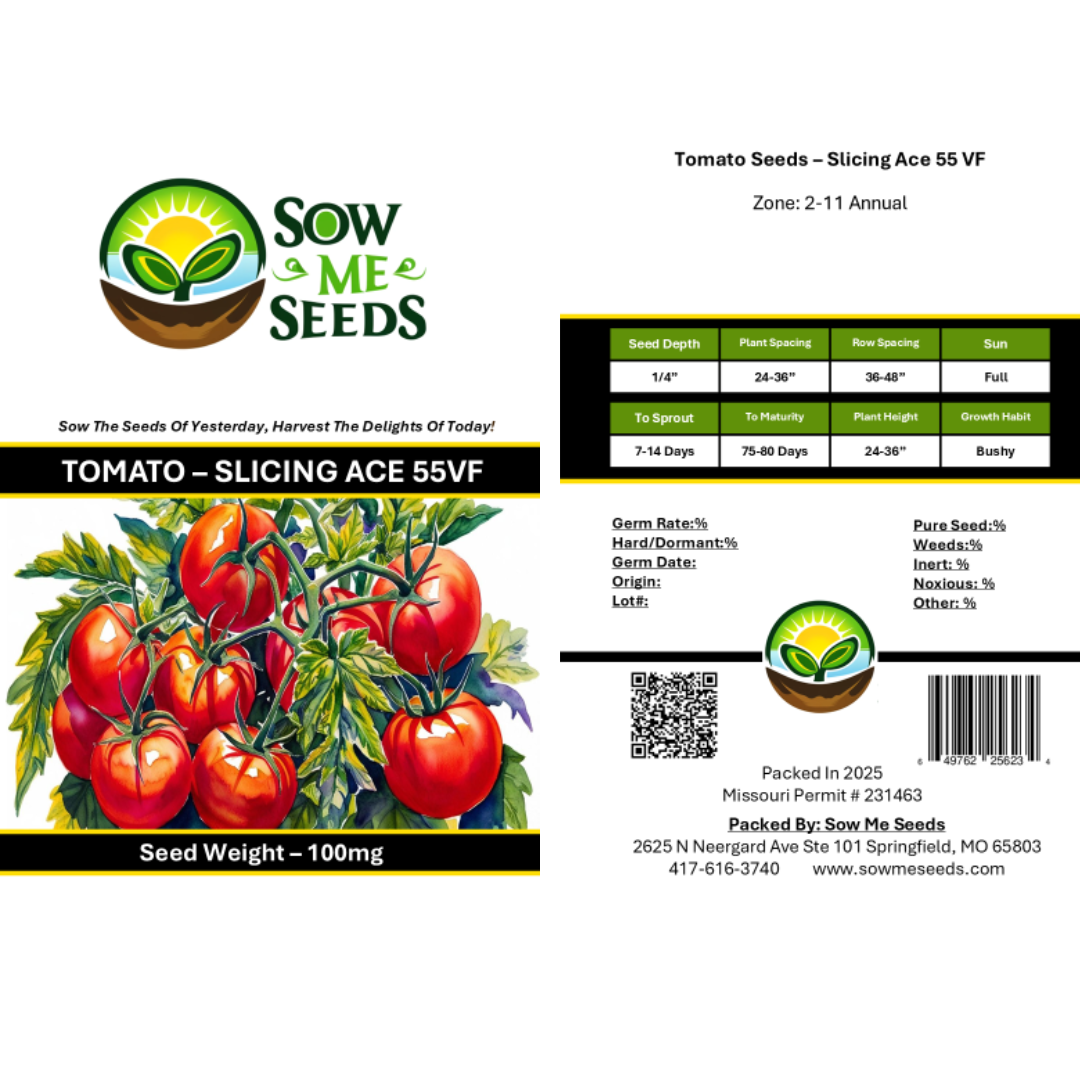 Ace 55 VF is a classic determinate slicing tomato known for its low-acid, mild flavor and crack-resistant fruits. With strong disease resistance and compact plants, this heirloom favorite is perfect for fresh eating, sandwiches, and small-space gardens.