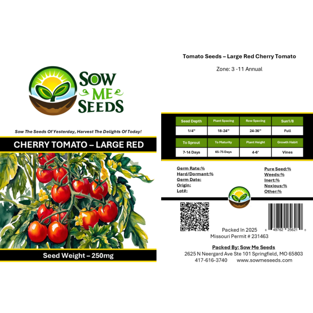 Large Red Cherry Tomatoes are a prolific heirloom variety that delivers clusters of juicy, sweet-tart fruits about 1 inch in size. These vigorous plants are a summer garden favorite β perfect for snacking, salads, and fresh eating straight off the vine.